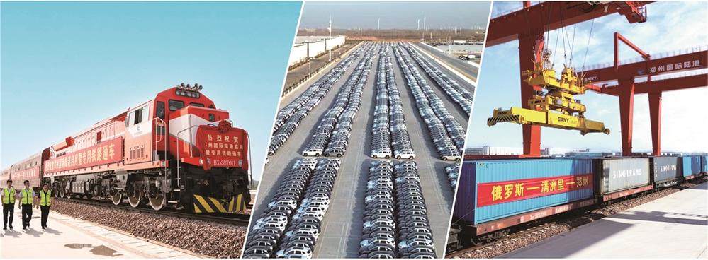 左图为郑州国际陆港专用铁路通车;中图为停放在西作业区的新能源汽车;右图为从郑州到俄罗斯的中欧班列。 赵黎昀/供图
